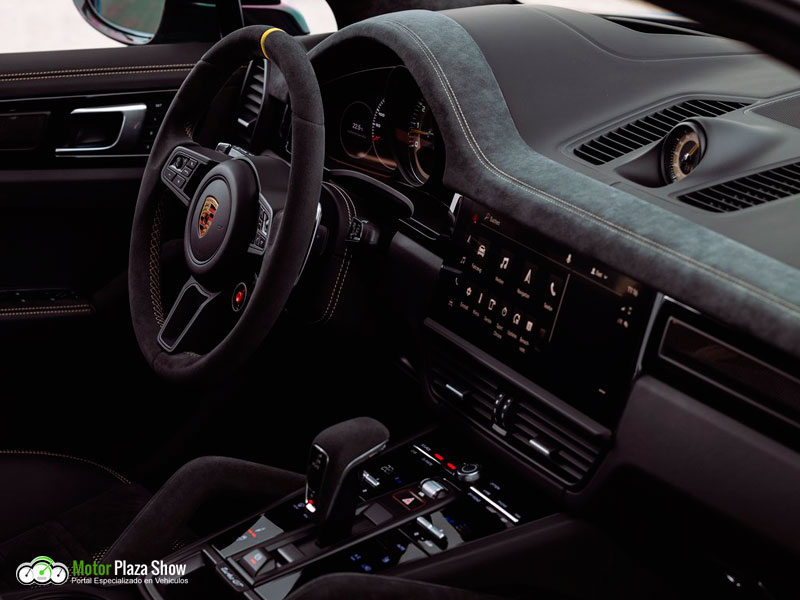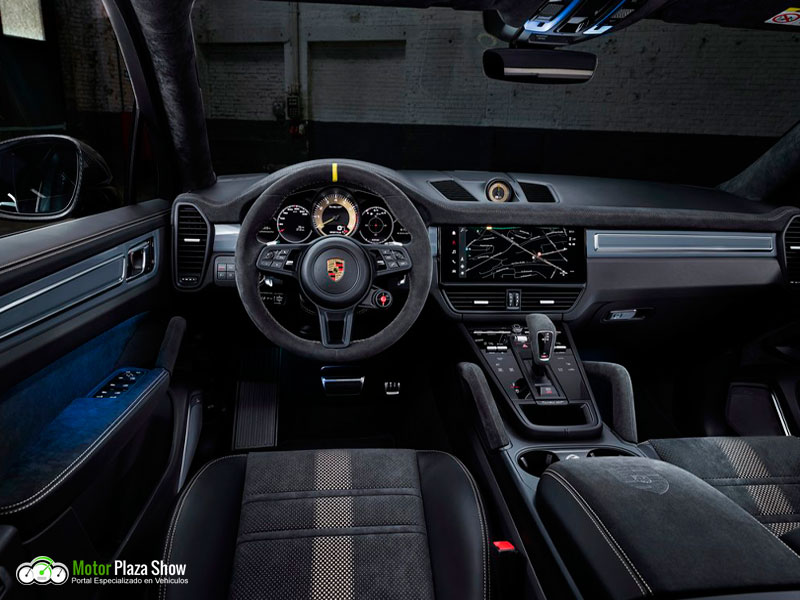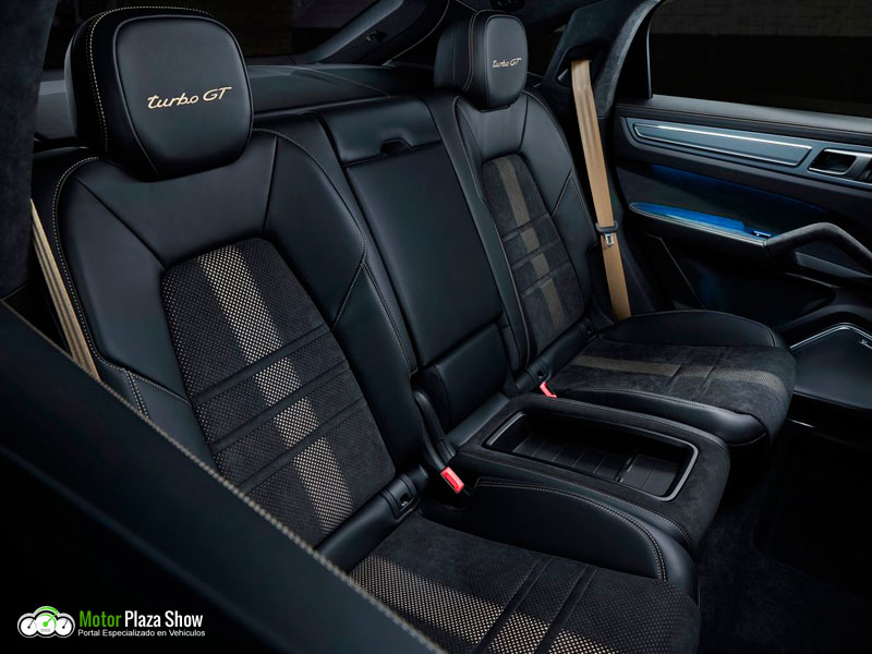 El carácter deportivo del Porsche Cayenne Turbo GT se pone de manifiesto en el equipamiento de serie de alta calidad y en el equipamiento de Alcántara ampliado de su interior. Los asientos deportivos de ocho posiciones en la parte delantera y el sistema de asientos traseros deportivos con dos plazas son de serie. Cada uno de ellos es específico de GT con paneles centrales de asiento perforados en Alcántara, detalles de contraste en Neodyme o Gris Ártico y la inscripción «turbo GT» en sus reposacabezas. Como es de esperar en los coches deportivos de Porsche, el volante deportivo multifunción cuenta con una marca amarilla a las 12 horas. Dependiendo de la tapicería especificada, algunas franjas de acento están acabadas en Negro mate.